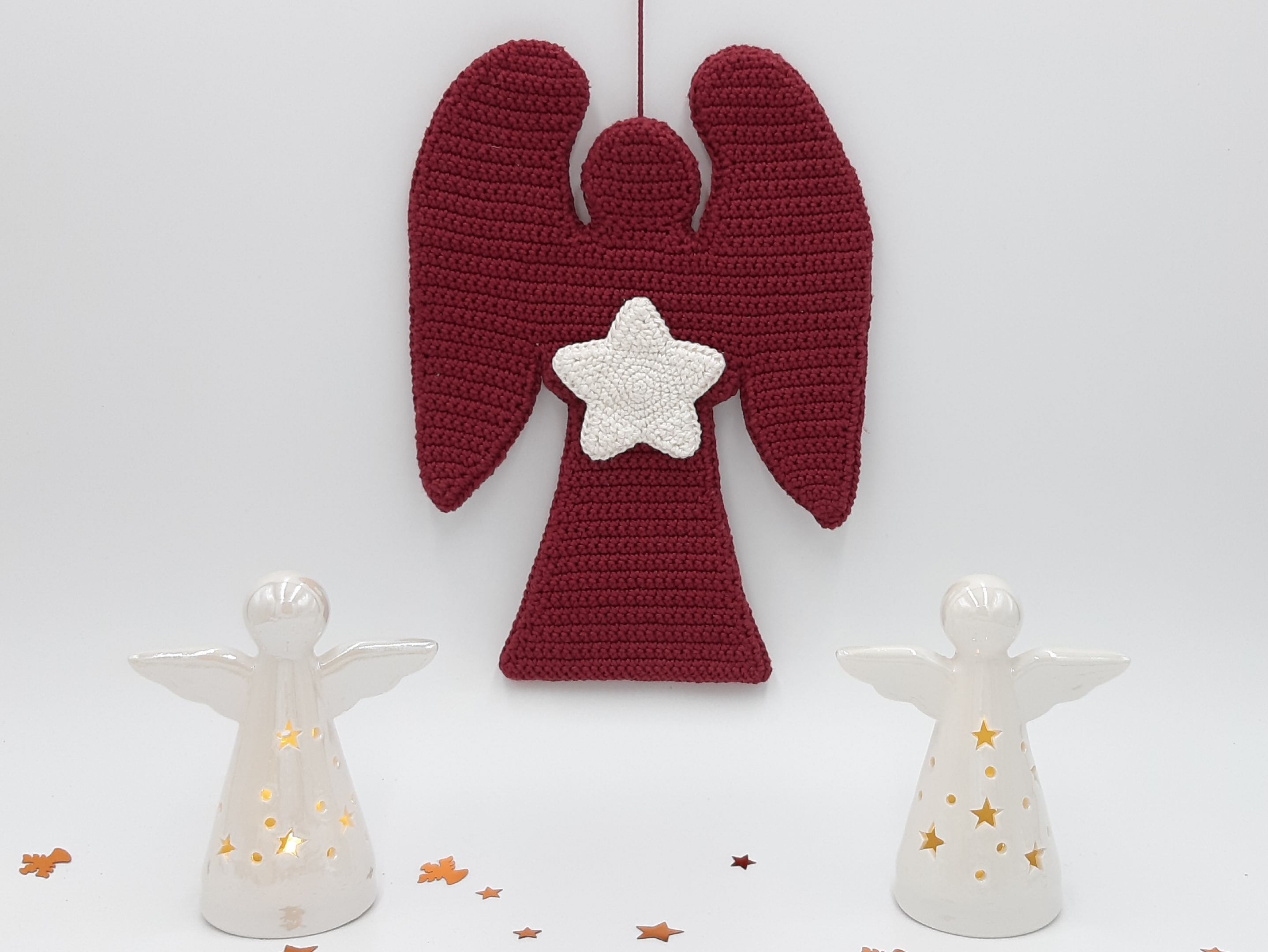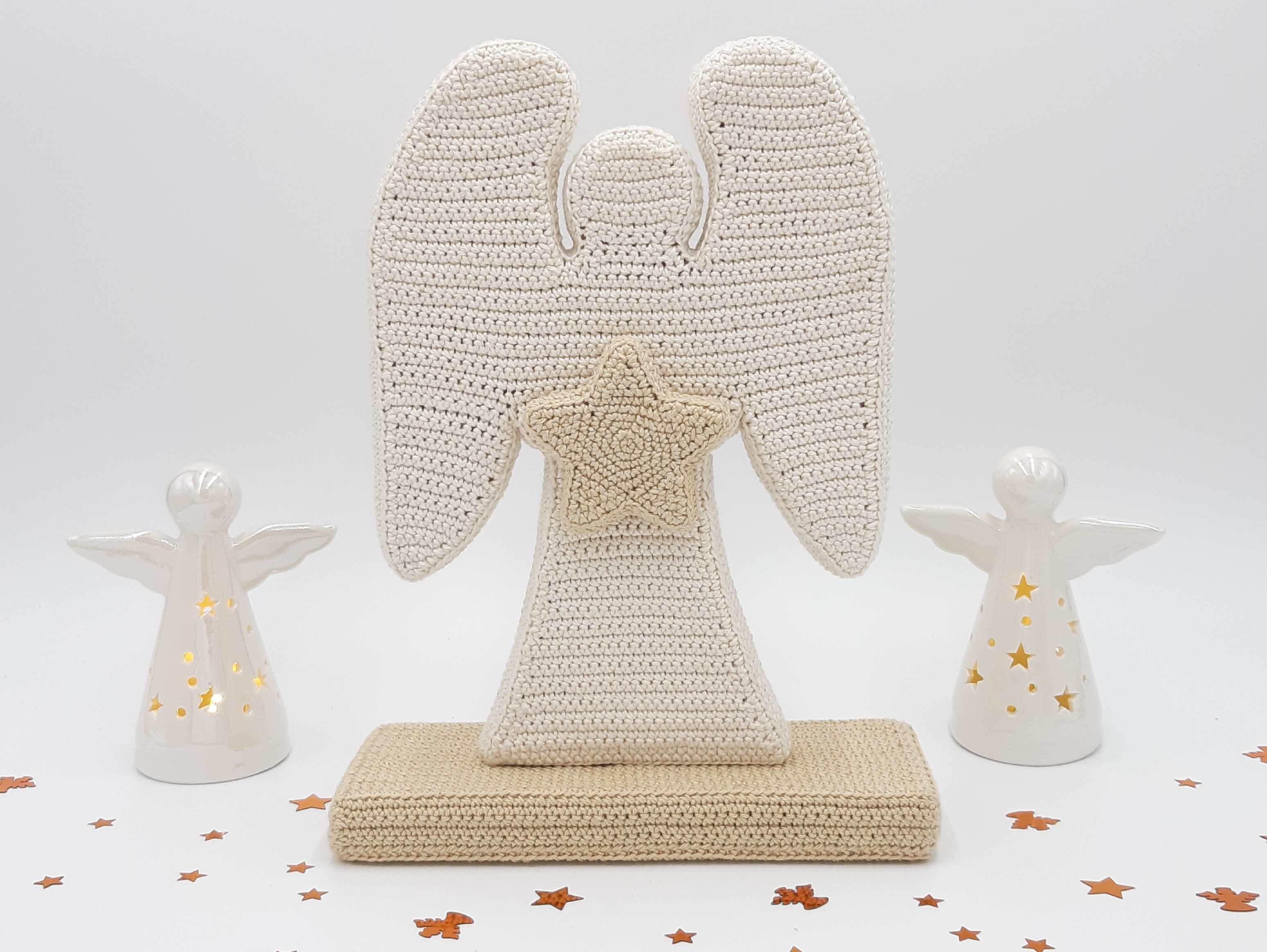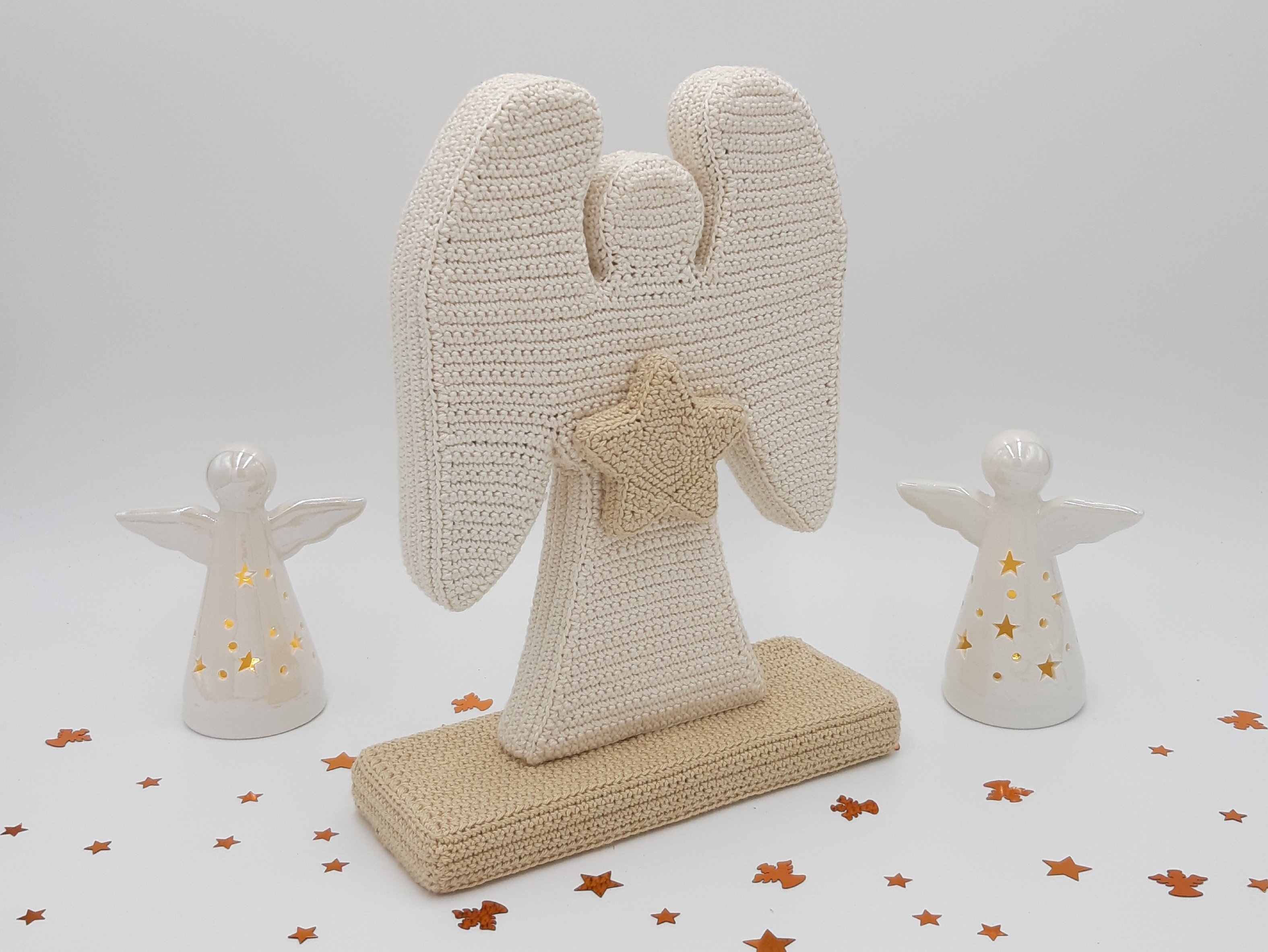 Die Anleitung umfasst: den Engel, den Stern und den Sockel, inkl. Häkeldiagramm für den Engel.