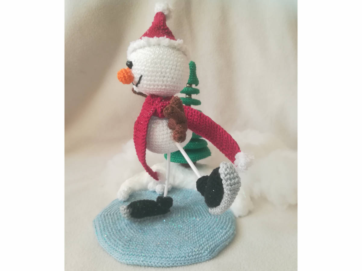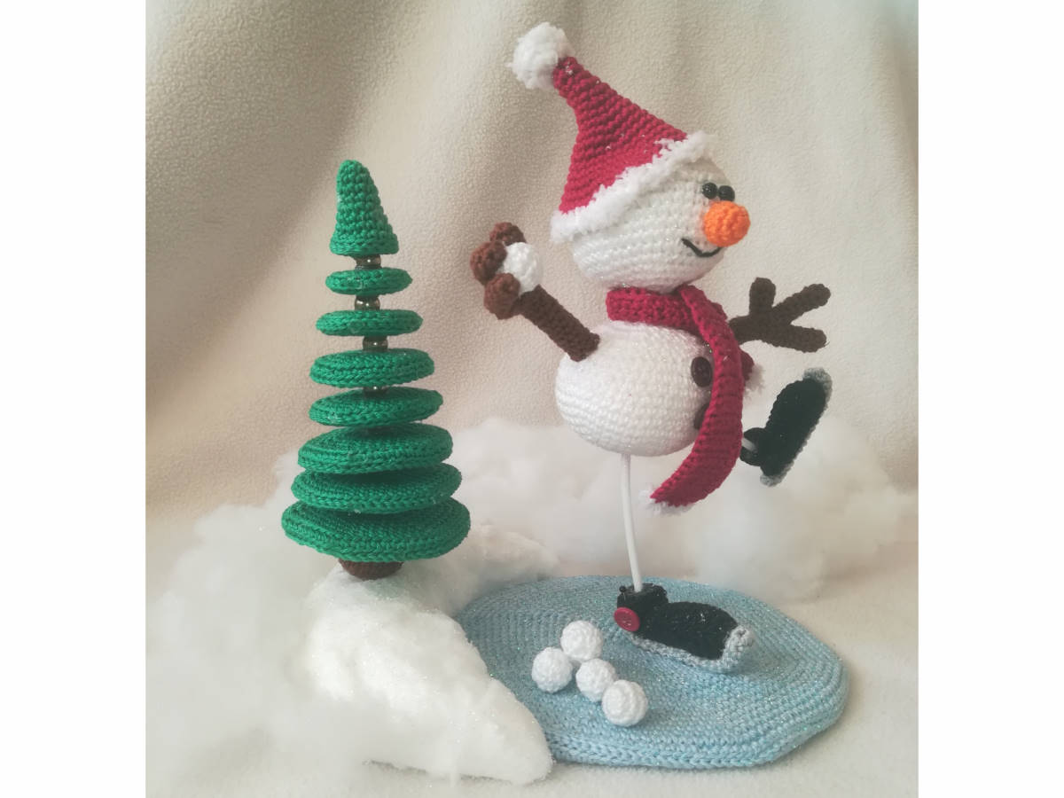 Die Anleitung umfasst: den Schneemann auf Schlittschuhen, den Tannenbaum, die Eisfläche und den Schneewall.