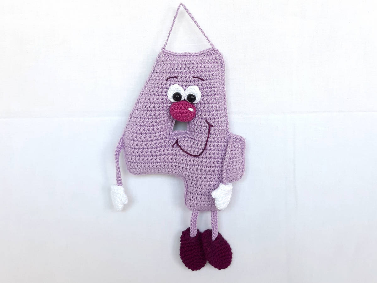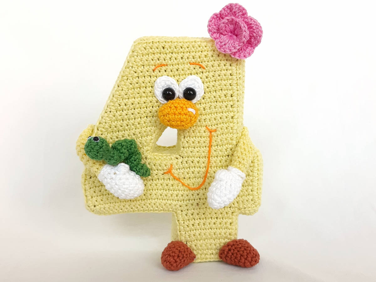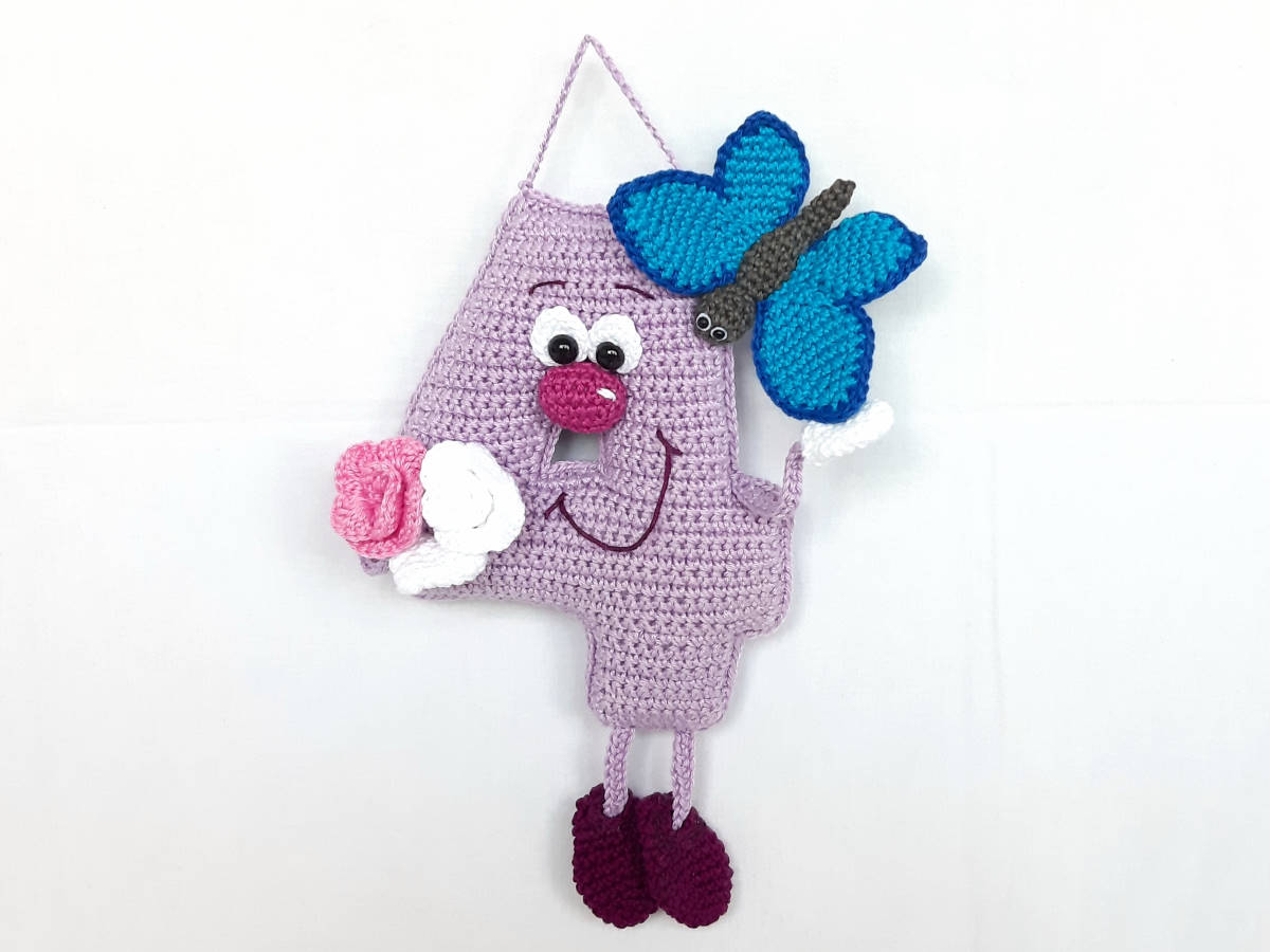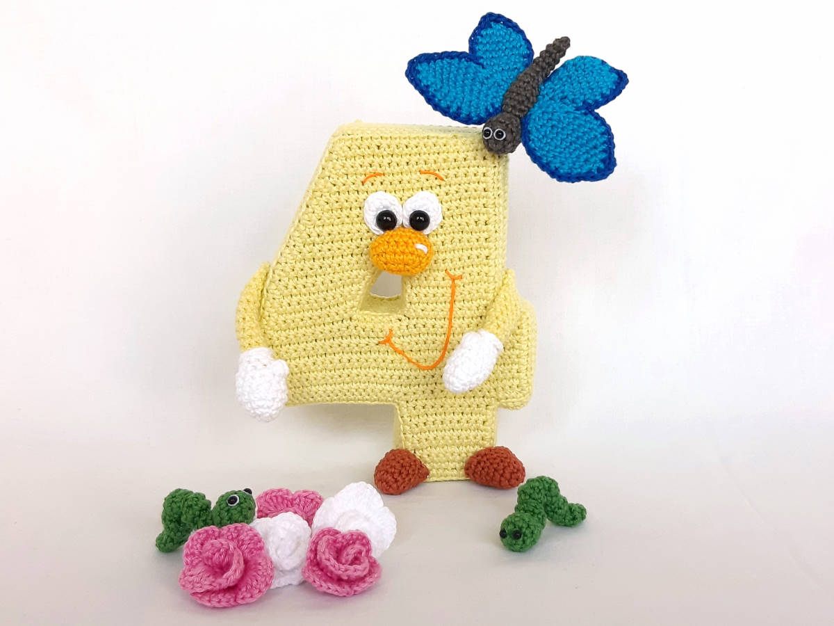 Die Anleitung umfasst: die Nummer 4 in in stehender 3D und hängender Variante, sowie für das Röschen, die Raupe und den Schmetterling, inkl. Häkeldiagramm für die Nummer 4.