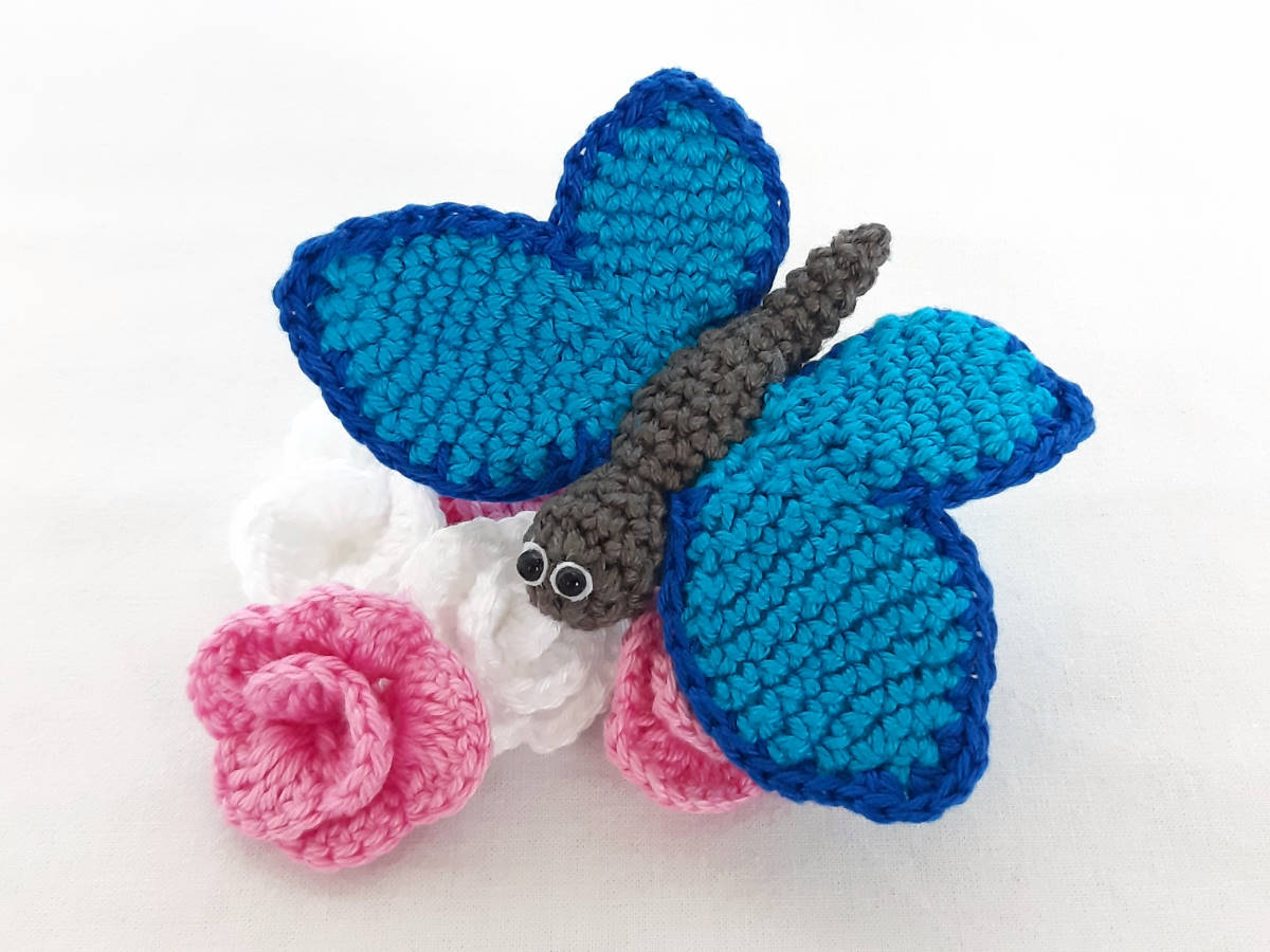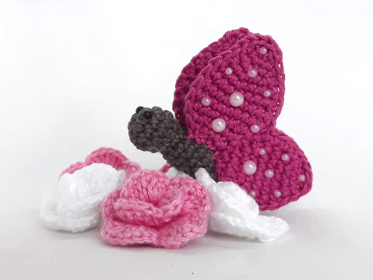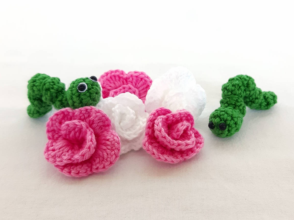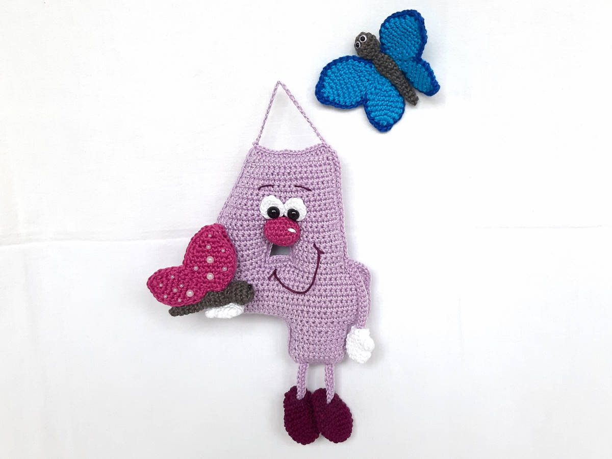 Die Anleitung umfasst: die Nummer 4 in in stehender 3D und hängender Variante, sowie für das Röschen, die Raupe und den Schmetterling, inkl. Häkeldiagramm für die Nummer 4.