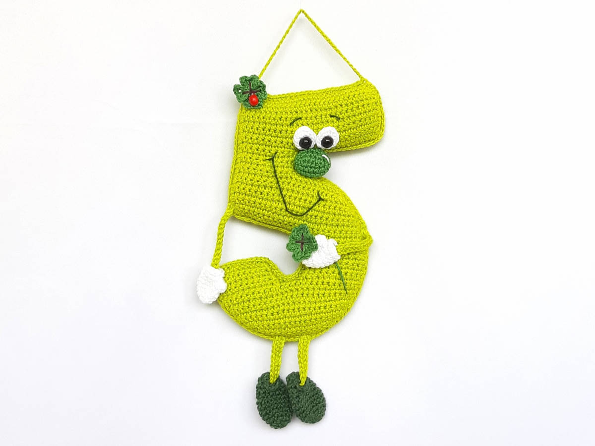 Die Anleitung umfasst: die Nummer 5 in stehender 3D und hängender Variante, sowie für die beiden Glückspilze und das vierblättrige Kleeblatt, inkl. Häkeldiagramm für die Nummer 2.