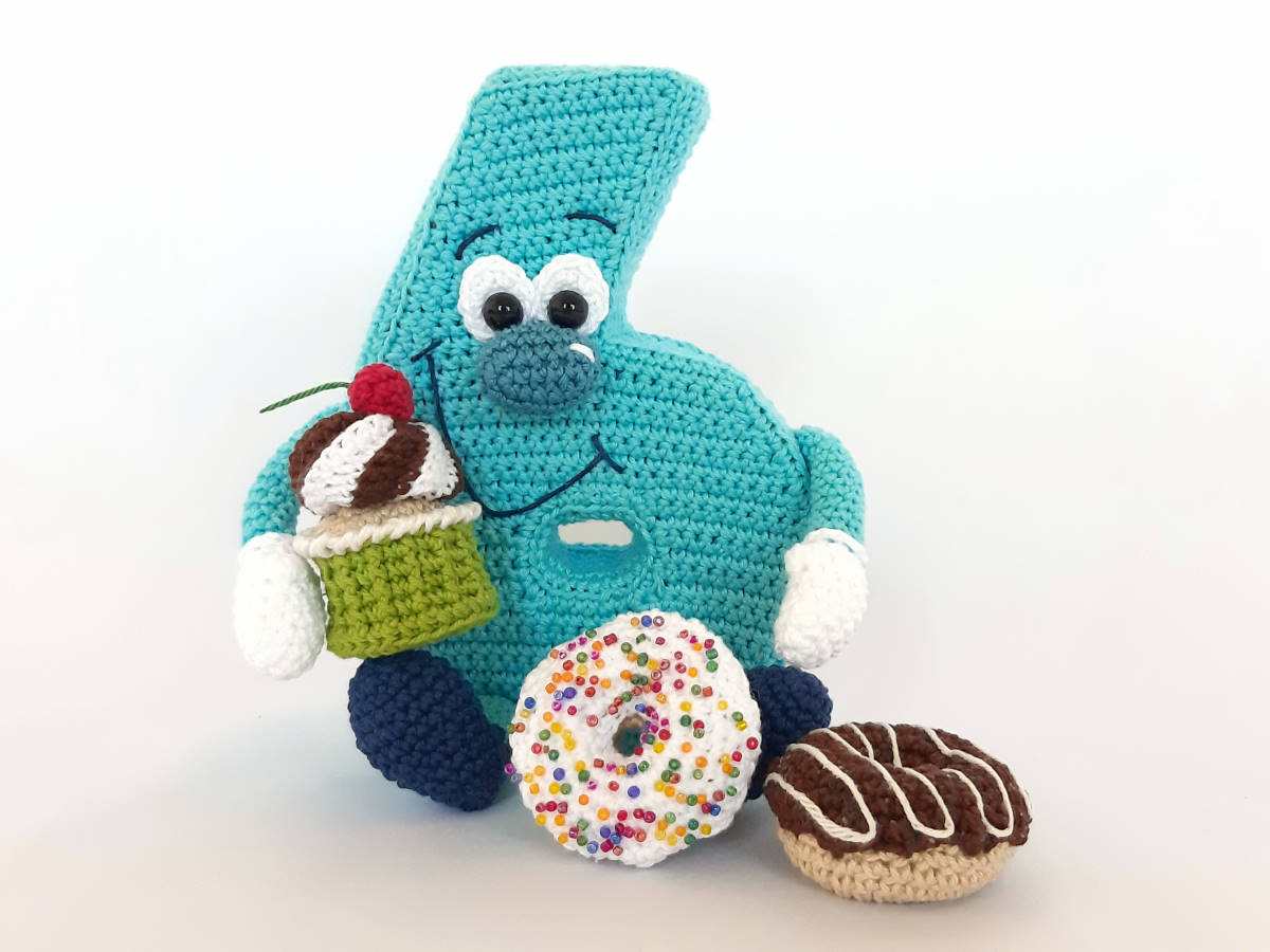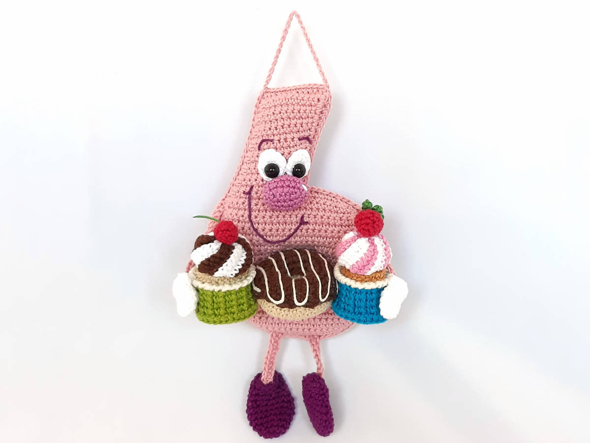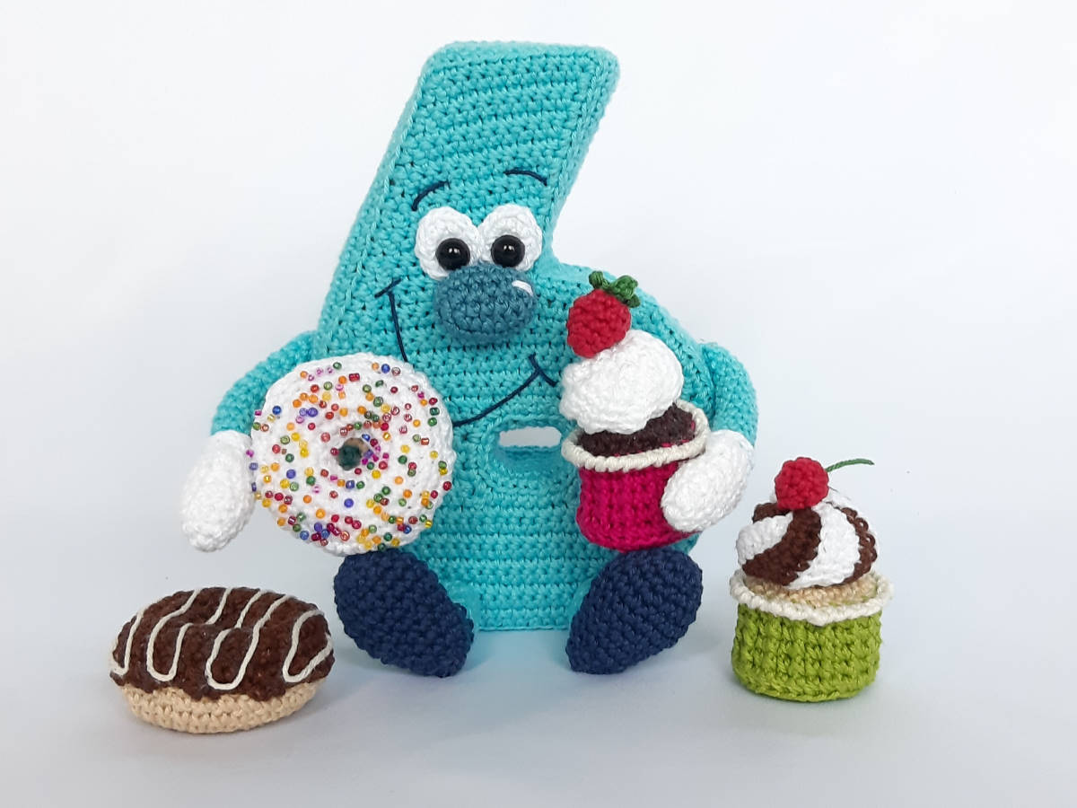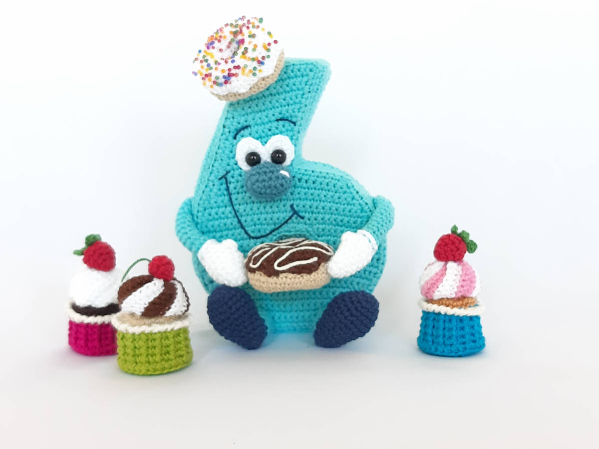Die Anleitung umfasst: die Nummer 6 in stehender 3D und hängender Variante, sowie für die Cupcakes und Donuts, inkl. Häkeldiagramm für die Nummer 6.