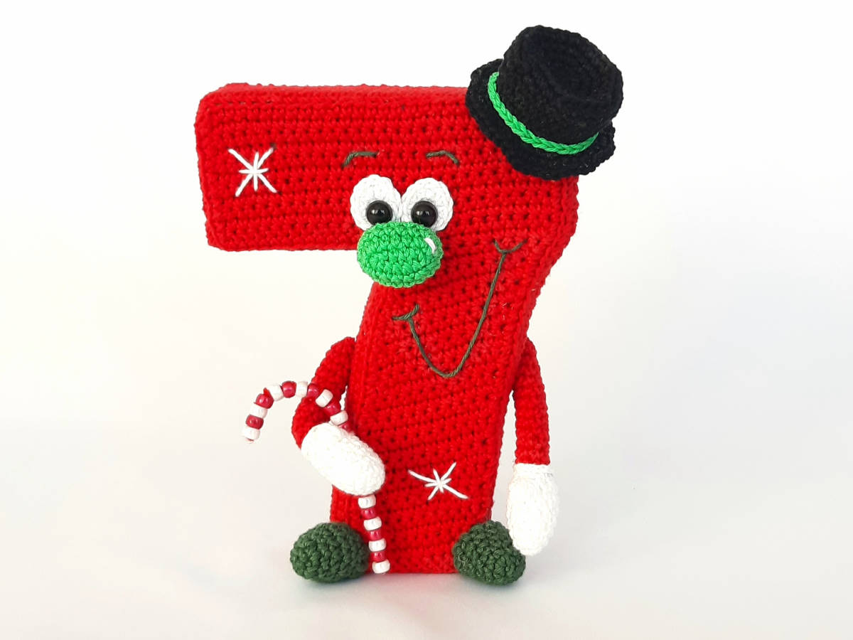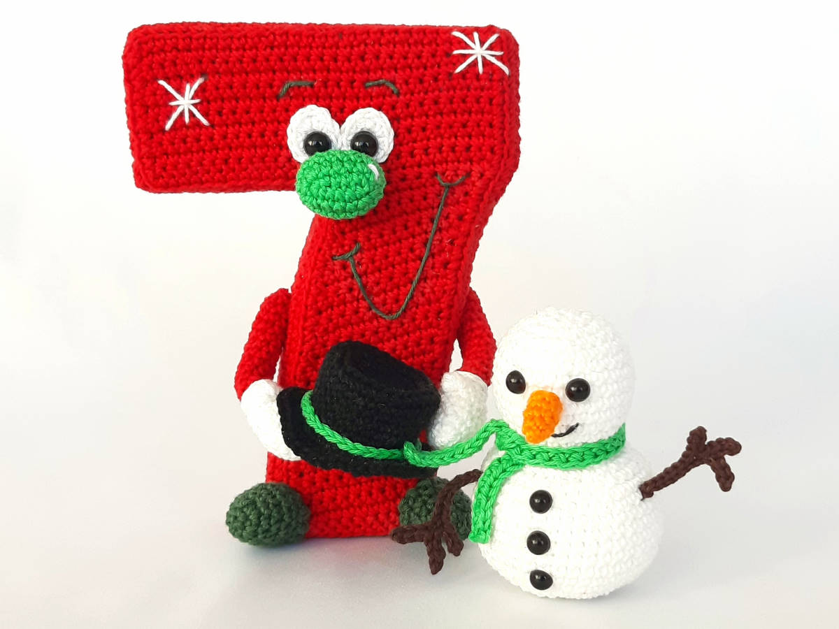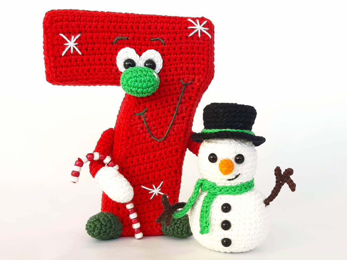 Die Anleitung umfasst: die Nummer 7 in stehender 3D und hängender Variante, sowie für den Schneemann und die Zuckerstange, inkl. Häkeldiagramm für die Nummer 7.