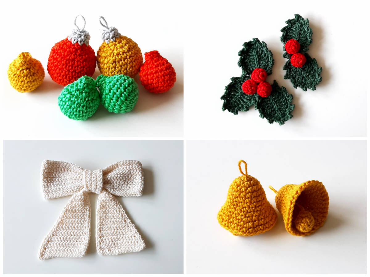 Die Anleitung umfasst: die Kerzen, die Ilex Dekoration, die Weihnachtskugeln in 2 Größen, die Glöckchen und die Schleife.